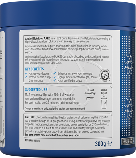 Applied Nutrition AAKG ist ein Premium-Aminosäure-Ergänzungsmittel. Es besteht aus der Aminosäure Arginin, die im Verhältnis 2:1 an ein Alpha-Ketoglutarat-Molekül gebunden ist. Jede Portion ist vollgepackt mit 3 Gramm AAKG, um Ihr Training zu unterstützen. Das Pulver ist praktisch verpackt und einfach zu mischen, perfekt für die Killer-Workouts im Fitnessstudio!.