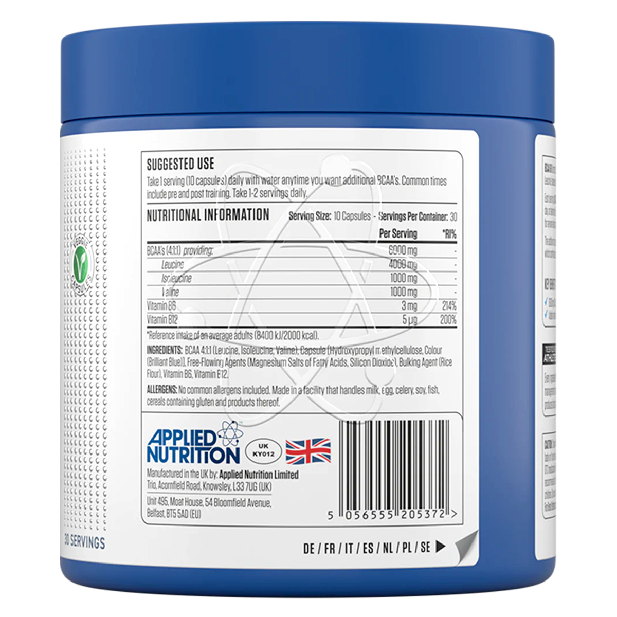 Zutaten: BCAA 4:1:1 (Leucin, Isoleucin, Valin), Kapsel (Hydroxypropylmethylzellulose), Farbstoff (Brillantblau), Fließhilfsmittel (Magnesiumsalze von Speisefettsäuren, Siliciumdioxid), Füllstoff (Reismehl), Vitamin B6, Vitamin B12.