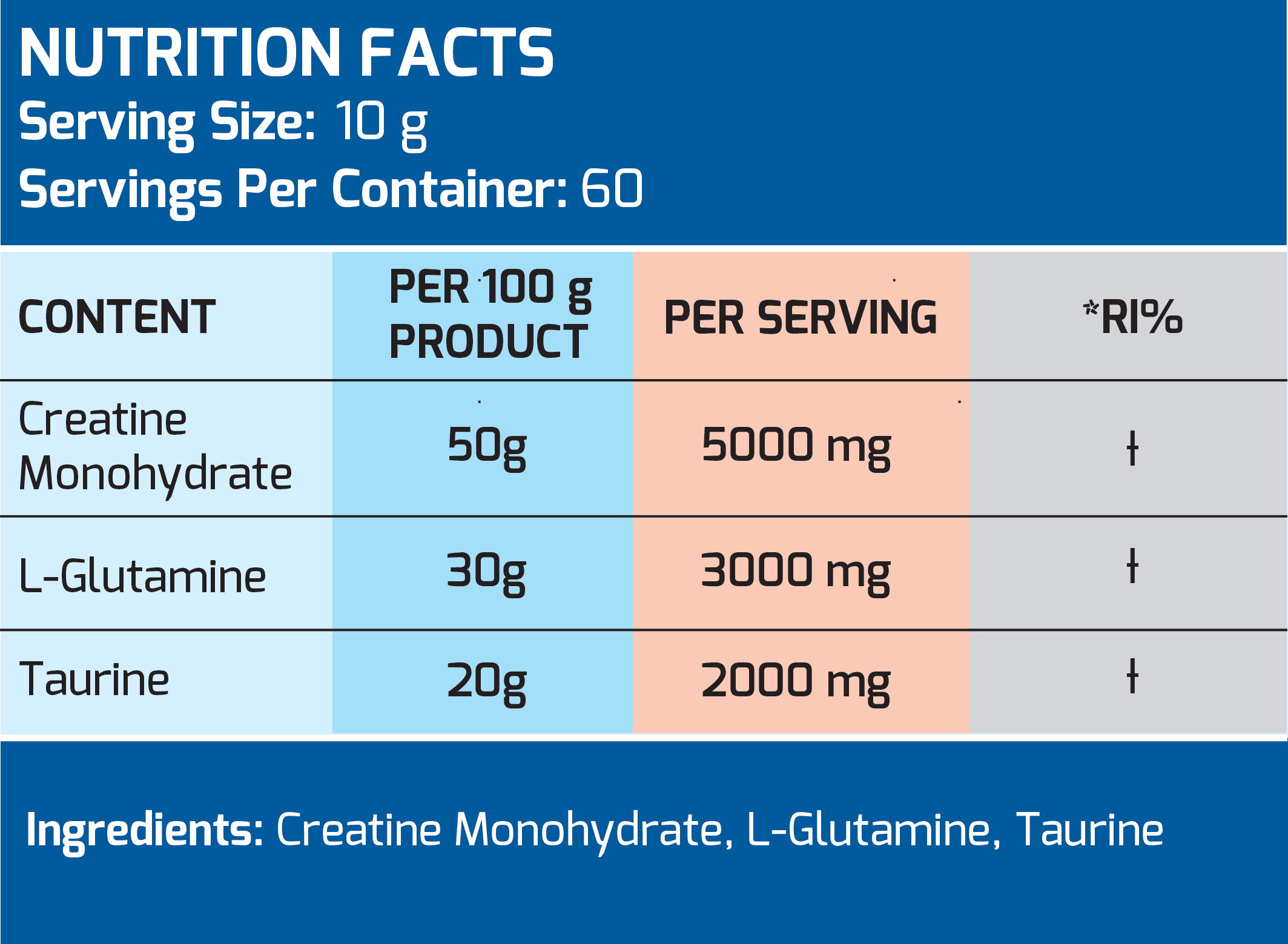 Zutaten: Kreatin Monohydrat (Creapure®), L-Glutamin Kyowa Quality ® (KQ), Taurin.