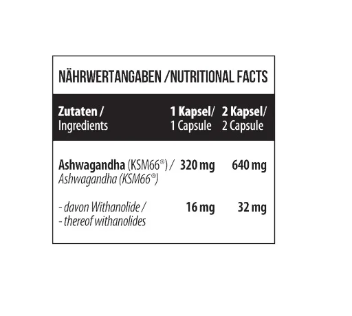 Enthält 640 mg hochwertiges KSM-66® Ashwagandha-Wurzelextrakt standardisiert auf 5% Withanolide pro Kapsel. Ashwagandha ist eine traditionelle Heilpflanze aus Indien, die auch als Schlafbeere oder Winterkirsche bekannt ist. Sie wird seit Jahrhunderten in der ayurvedischen Medizin verwendet, um Stress abzubauen, die Schlafqualität zu verbessern und die geistige Leistungsfähigkeit zu steigern.