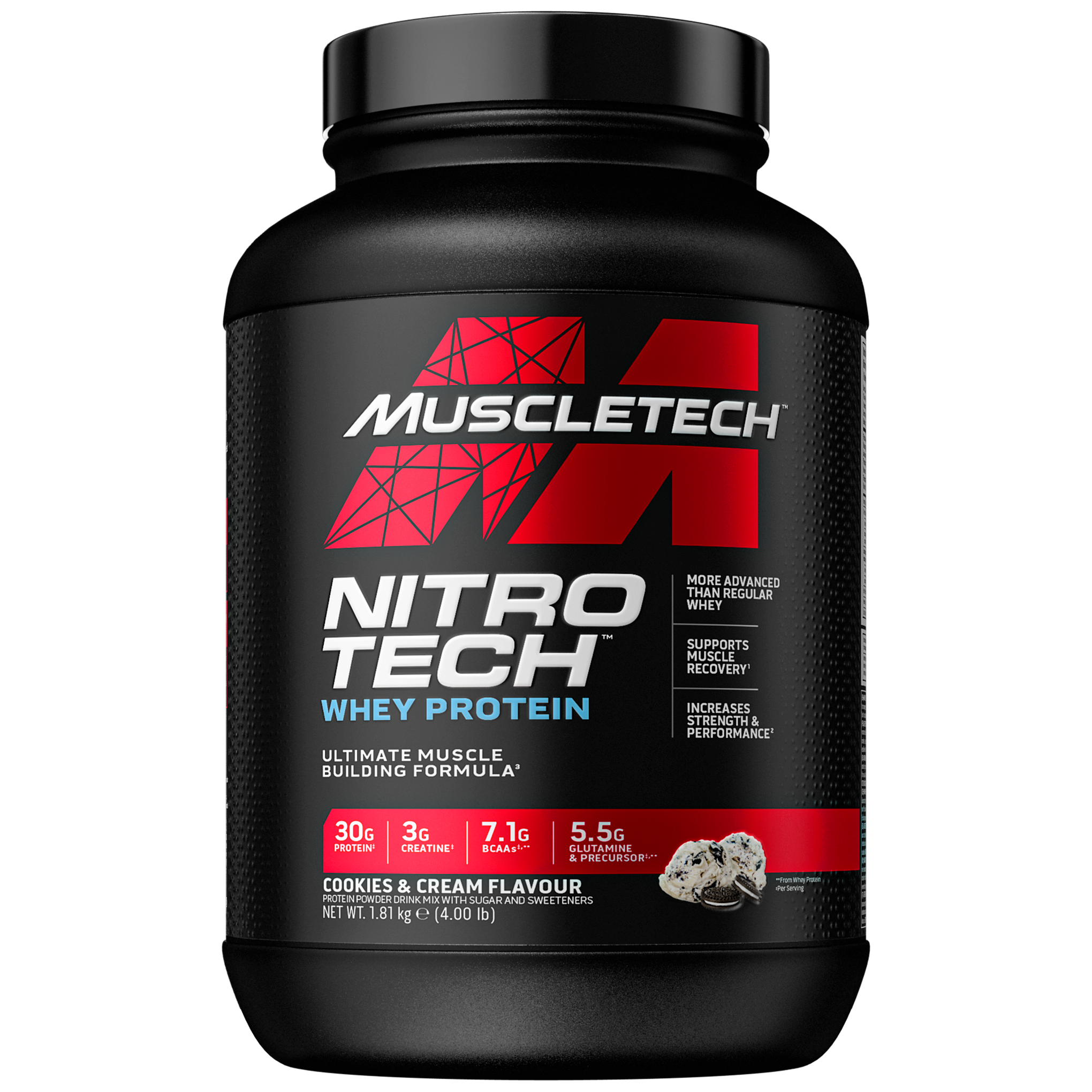 Seit 25 Jahren nimmt es die bahnbrechende Nitro Tech-Formel® von MuscleTech mit allen Herausforderern auf. Dieses Nitro Tech Whey Protein bringt dich mit unglaublichen 30 Gramm Protein pro Portion auf die nächste Stufe, um das Muskelwachstum und die Muskelregeneration nach intensivem Training zu unterstützen. Jede Portion enthält außerdem bis zu 3 Gramm Kreatin-Monohydrat, über 6 Gramm BCAAs und starke Dosen Glutamin. Und mit all den erstaunlichen Geschmacksrichtungen, die es gibt, ist Geschmackszufriedenheit garantiert!