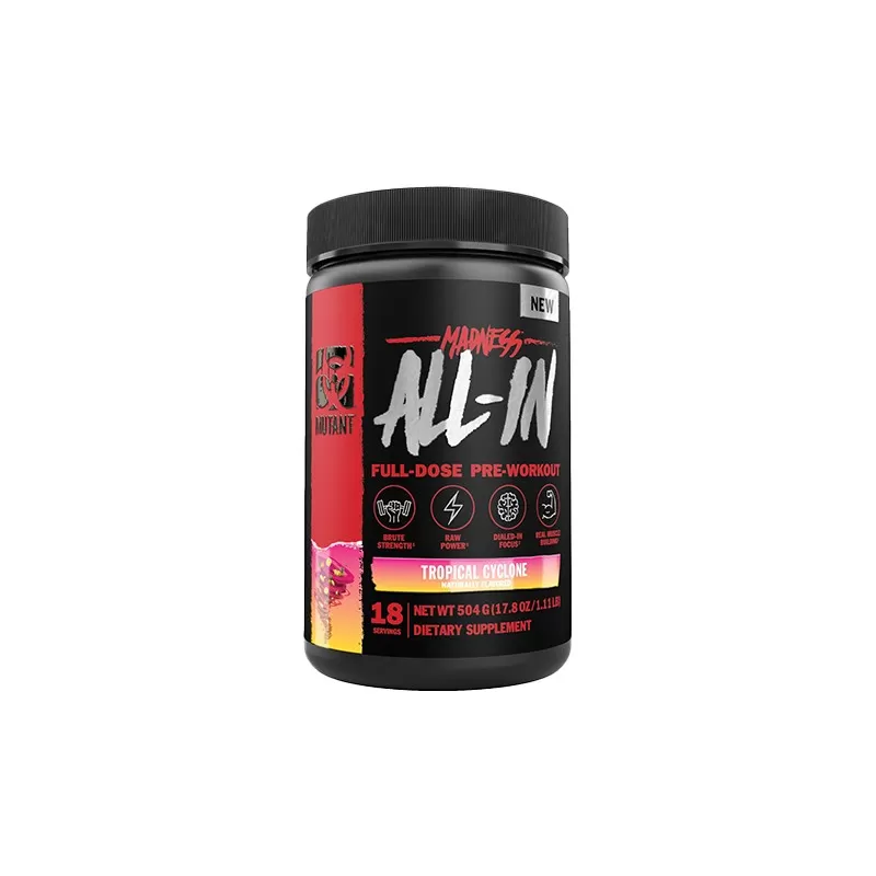 Mutant Madness All-In ist das ultimative Pre-Workout für Kraftsportler, die niemals aufhören und niemals abschalten. Es kombiniert alle bewährten Inhaltsstoffe in voller Dosierung, die du für ein mörderisches Workout brauchst! Jede Portion ist vollgepackt mit hohen Dosen von Citrullin-Malat, Kreatin-Monohydrat, Beta-Alanin, BCAAs, L-Tyrosin und vielen mehr. Nutze wahnsinnige Power und geh ALL-IN!
