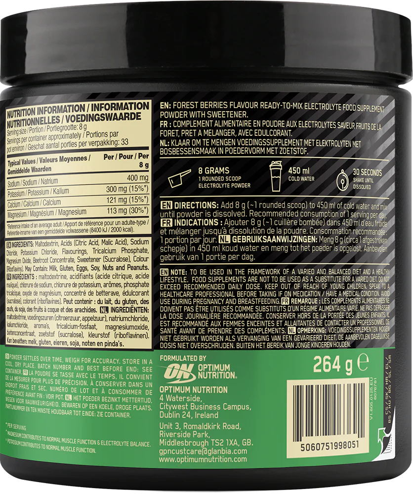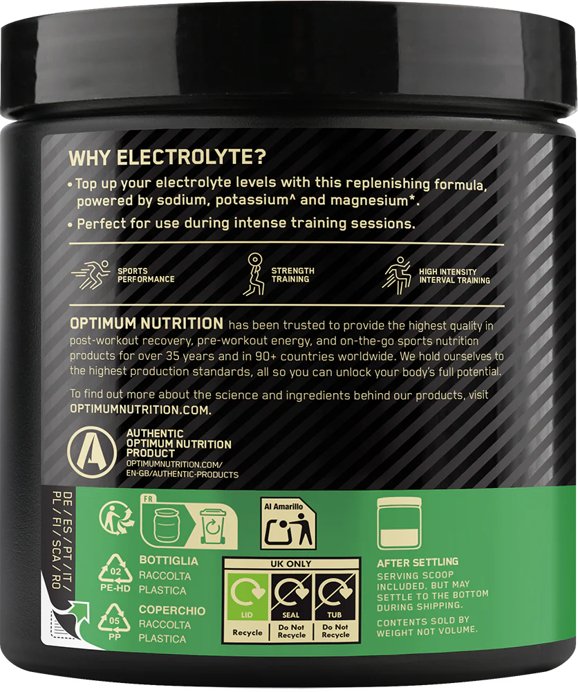 Optimum Nutrition Electrolyte Pulver ist eine erfrischende und effektive Möglichkeit, Ihre Elektrolytwerte während anspruchsvoller Workouts aufzufüllen. Dieses fruchtgeschmackliche Ergänzungsmittel liefert eine präzise Mischung wichtiger Elektrolyte, darunter 400 mg Natrium, 300 mg Kalium und 113 mg Magnesium pro Portion. Magnesium trägt zur Elektrolytbalance bei, unterstützt die normale Muskelfunktion und hilft, Müdigkeit und Erschöpfung zu verringern. Kalium trägt zur normalen Muskelfunktion bei und hilft, einen normalen Blutdruck aufrechtzuerhalten. Dies macht es zu einer großartigen Ergänzung Ihres Trainingsplans bei Krafttraining, hochintensivem Intervalltraining (HIIT) oder allen Ausdauereinheiten, bei denen Hydratation und Elektrolytersatz entscheidend sind.