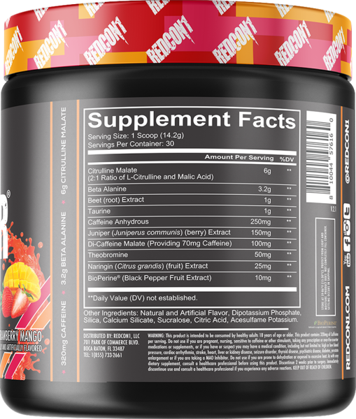 Zutaten: Citrullin Malat, Beta Alanin, Taurin, Koffein, Juniper, Di-Caffeine Malat, Theobromin, Naringin (Citrus Gardis Fruchtextrakt), Bioperin® natürliche und künstliche Aromen, Dipotassiumphosphat, Silica, Calciumsilikat, Sucralose, Zitronensäure, Acesulfam-Kalium.