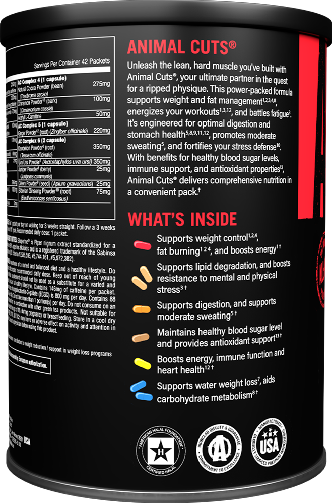 Täglich 1 Päckchen (8 Kapseln) mit ausreichend Flüssigkeit zu sich nehmen. Nehmen Sie das Animal Cuts 3 Wochen lang und machen Sie danach eine Woche Pause. Danach können Sie das Produkt für weitere drei Wochen zu sich nehmen.