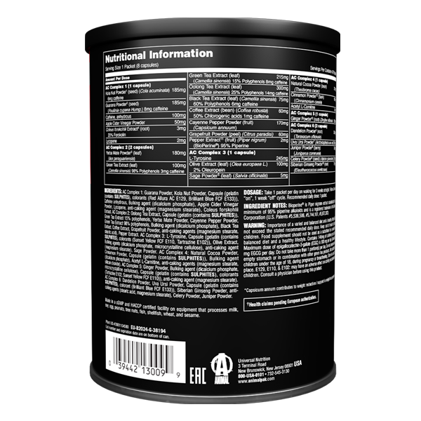 Zutaten: AC Complex 1: Guarana-Pulver,Kolanusspulver, Kapselhülle (Gelatine (enthält Sulfite), Farbstoff (Allurarot AC E129, Brillantblau FCF E133)), Koffein wasserfrei, Füllstoff (Dicalciumphosphat), Apfelessig Pulver, Lycopin, Trennmittel (Magnesiumstearat), Coleus Forskohlii (Wurzel), AC Complex 2: Oolong-Tee-Extrakt, Kapselhülle: Gelatine (enthält Sulfite), Grüner Tee Extrakt (Blatt) 15% Polyphenole, Yerba Mate Pulver, Cayennepfefferpulver, Grüner Tee Extrakt (Blatt) 98% Polyphenole,Füllstoff (Dicalciumphosphat),Schwarzer Tee-Extrakt, Kaffee Extrakt, Grapefruitpulver, Trennmittel (Magnesiumstearat), AC Complex 3: L-Tyrosin, Kapselhülle: Gelatine (enthält Sulfite), Farbstoffe (Gelborange FCF E110, Tatrazin E102),Olivenextrakt, Füllstoff (Dicalciumphosphat, mikrokristaline Cellulose), Trennmittel (Magnesiumstearat), Salbeipulver, AC Complex 4: Kola-Pulver, Zimtpulver,Kapselhülle: Gelatine (enthält Sulfite), Füllstoff (Dicalciumphosphat), Acetyl L-Carnitin, Trennmittel (Magnesiumstearat, Silikondioxid), AC Complex 5: Ginseng-Pulver, Füllstoffe (Dicalciumphosphat, mikrokristalline Cellulose), Kapselhülle: Gelatine (enthält Sulfite), Farbstoffe ( Gelborange FCF E110, Tartrazin E102), Trennmittel (Magnesiumstearat), AC Complex 6: Löwenzahnwurzelpulver, Uva Ursi-Pulver, Kapselhülle: Gelatine (enthält Sulfite), Farbstoffe (Brillantblau FCF E133), Sibirischer Ginseng, Antibackmittel Wirkstoffe (Magnesiumstearat, Stearinsäure),Selleriepulver, Wacholderpulver.